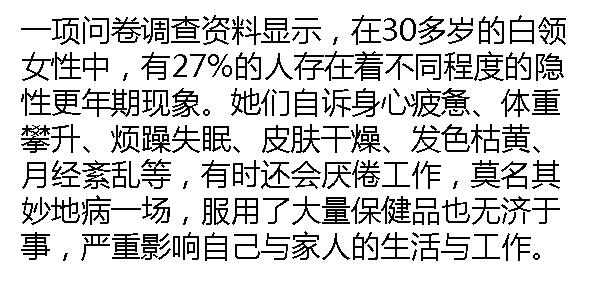 一般情况下,女性在45岁以后,卵巢功能开始衰退,雌激素分泌量锐减,这时,就出现包括卵巢在内一系列的衰老表现:首先是月经停止,随之而来的是骨质疏松、记忆力减退、皮肤皱褶、老年斑等,另外还出现泌尿系统萎缩。而卵巢早衰将这些变化提前了10年甚至15年,大大加速了女性衰老的进程。