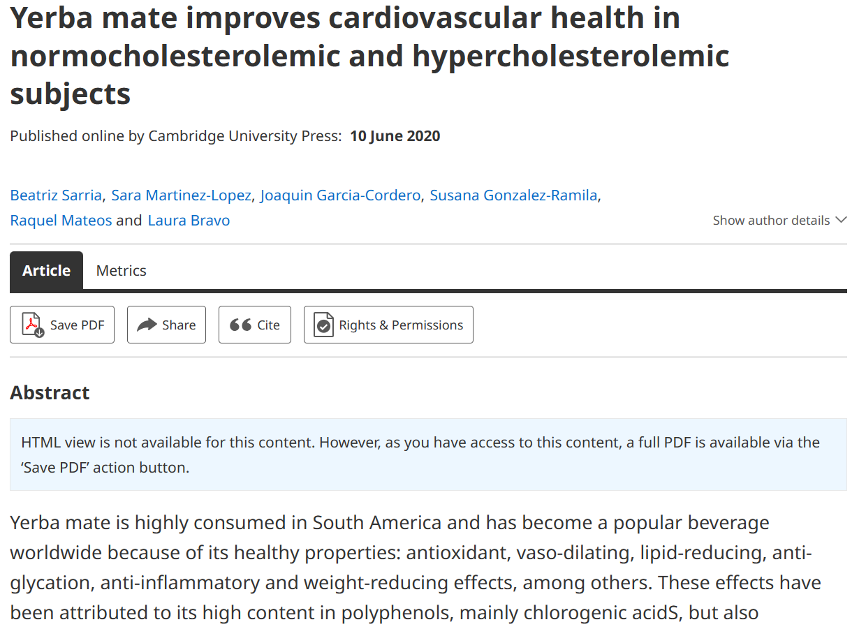 在2020年的一项随机对照试验(RCT)中,研究人员研究了连续八周每天饮用三次马黛茶饮料对心脏健康的影响,这项研究纳入了有和没有高胆固醇的研究对象(27人 vs 25人)。