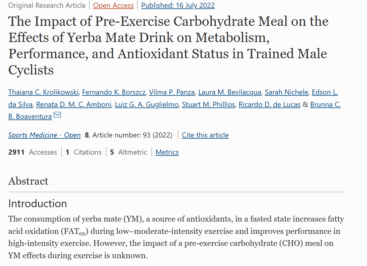此外,2022年一项针对自行车和铁人三项运动员的随机对照试验研究了在运动前连续7天在摄入碳水化合物后饮用250毫升含5克马黛茶叶的茶水的效果。研究发现,与单独使用碳水化合物或马黛茶相比,联合组在低强度和高强度的运动都可以增加脂肪燃烧,在高强度运动中也观察到显著的表现改善。