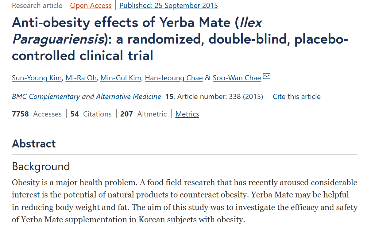 • 体重管理:在2015年的一项随机对照试验中,30名肥胖成年人在用餐时(早餐、午餐和晚餐)分别服用安慰剂和3克马黛茶胶囊。12周后发现,与安慰剂组相比,服用马黛茶组的体脂量和体脂率显著下降,腰臀比也显著降低。