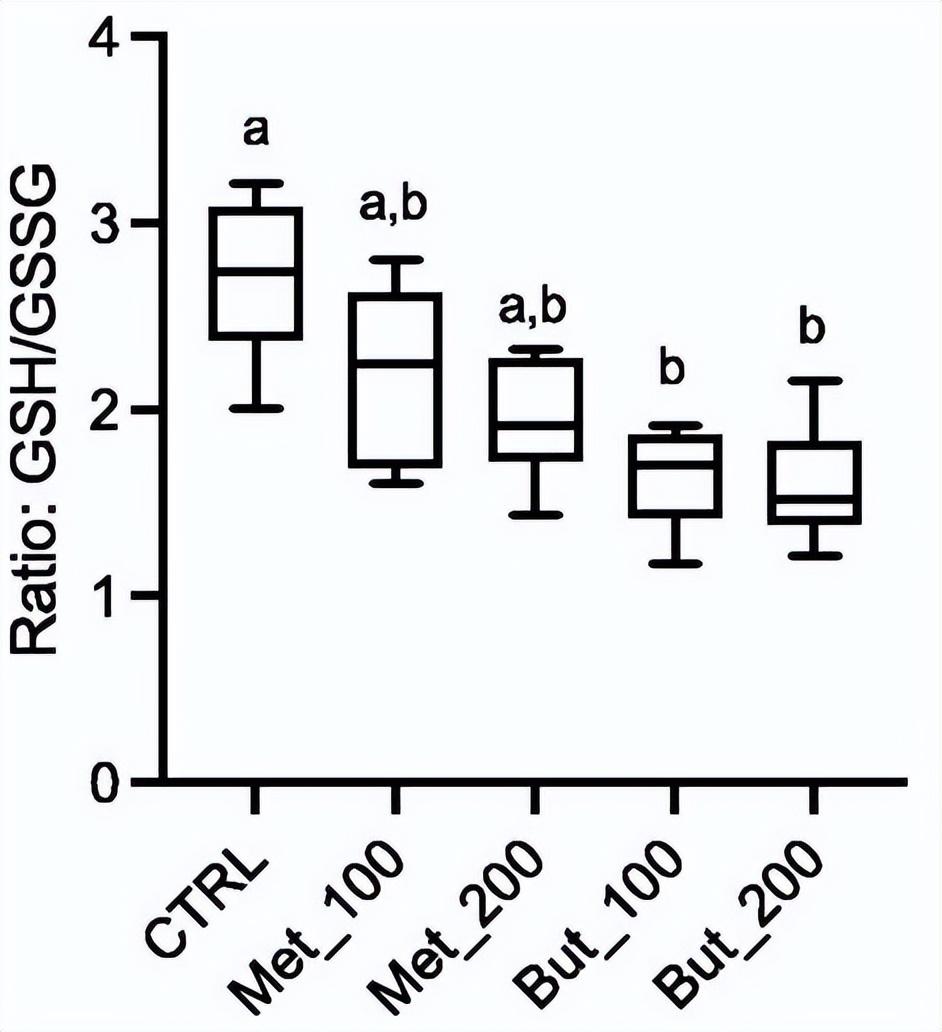 谷胱甘肽还原力是通过谷胱甘肽和GSSG水平以及GSSG/谷胱甘肽比率来确定的。与对照组相比,还原型谷胱甘肽的含量没有显示出显著的变化。