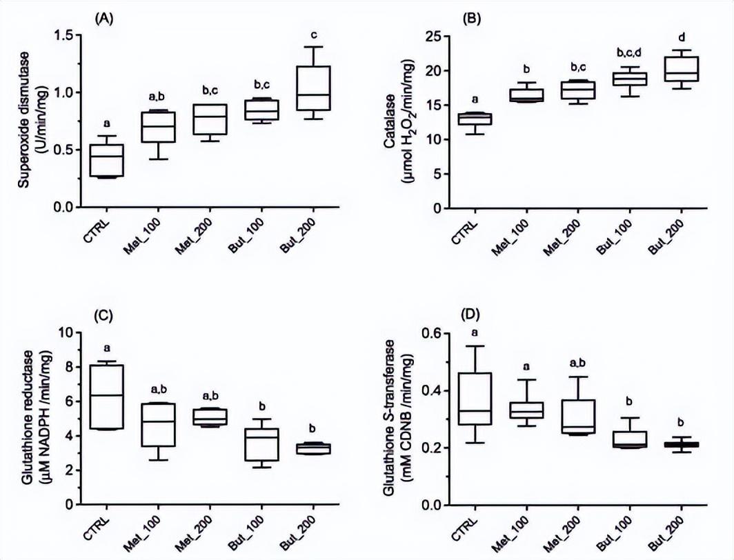 至于过氧化氢酶,两种对羟基苯甲酸酯在所有测试浓度中都有所增加。But-200组与任一对羟基苯甲酸酯处理组相比显示出显著的增加。谷胱甘肽还原酶和谷胱甘肽S-转移酶都经历了由对羟基苯甲酸酯处理诱导的活性抑制,尽管差异仅在对羟基苯甲酸丁酯