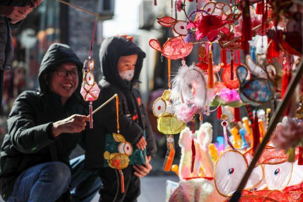 ↑1月20日,市民在江苏扬州东关历史街区购买兔子花灯。新华社发(齐立广 摄)